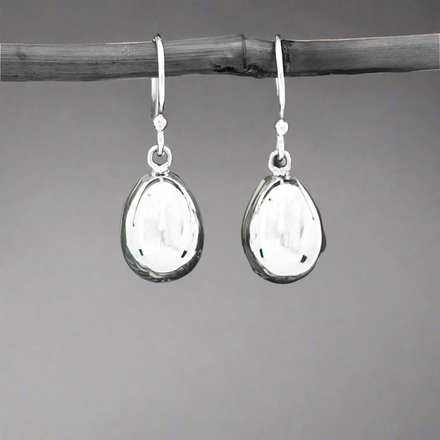 Suspended from sterling silver French ear wires with clear rubber stoppers, these handmade earrings are ideal for those who appreciate minimalist silver jewellery with a sculptural edge. A unique gift with natural charm and quiet sophistication.