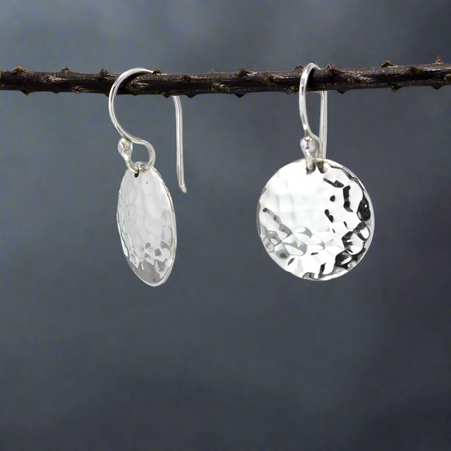 Our Artemis Disc Hammered Silver Earrings combine simplicity with elegance. Crafted in .950 silver with a hammered finish, these earrings are designed to catch the light with every movement, making them a versatile addition to any collection.