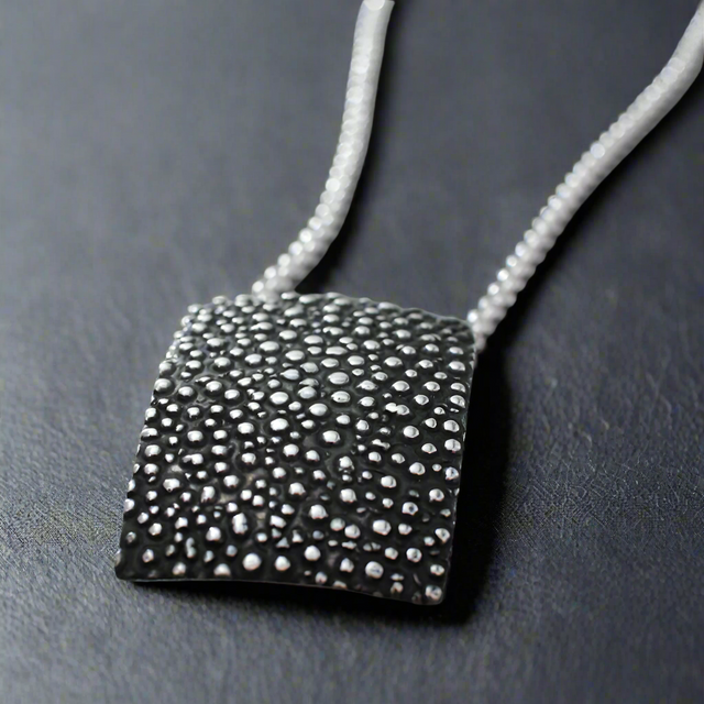 This rectangular silver pendant from the Firmament collection is handcrafted in solid .950 sterling silver. The surface features a dotted texture and a deep oxidised finish, creating a subtle contrast that enhances its modern shape. Clean lines and sculpted detailing make this an easy piece to style with both everyday outfits and more dressed-up looks.