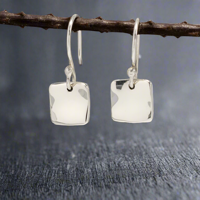 The Selene Small Wavy Square Silver Dangle Earrings offer a subtle play of light and texture through their gently undulating form. Meticulously handcrafted from solid .950 sterling silver, these dangle earrings blend a clean geometric shape with a wave-textured surface that catches the eye without overwhelming your look.