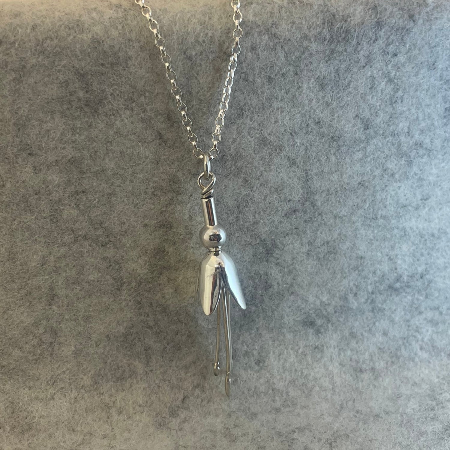 Inspired by the wild fuchsia blossoms found along the hedgerows of West Cork, this silver pendant features a hand-fabricated flower suspended from a delicate sterling silver chain. The sculpted form and mirror-finish polished surface capture the organic charm and brilliance of the bloom.