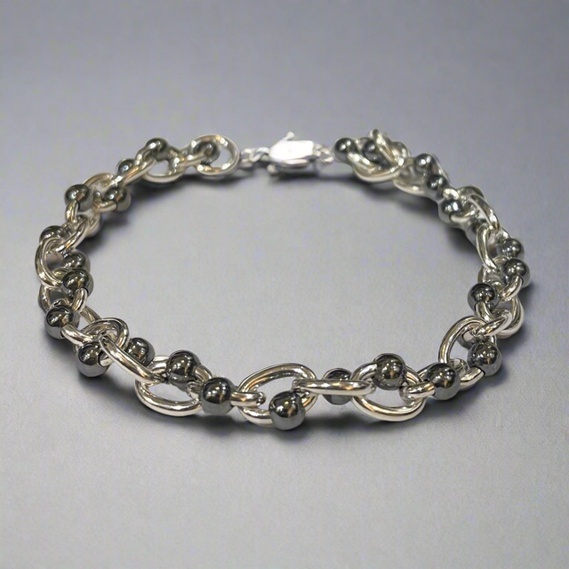 Made from solid .925 sterling silver, the detailed oblong links and oxidised bead accents come together to form a beautifully textured spiral design. The bracelet balances polished shine with oxidised contrast for a refined yet distinctive look.