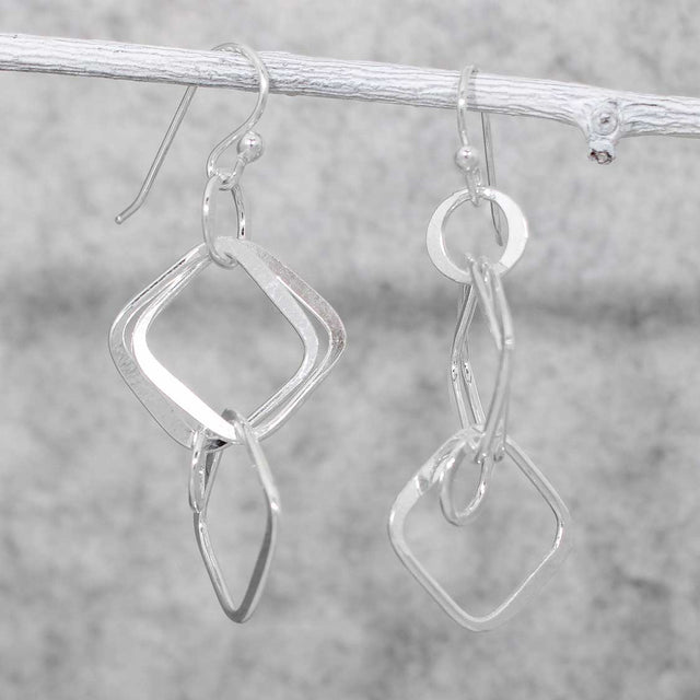 The Tara Bubbles Effervescence square dangle earrings are crafted in solid sterling silver, featuring three interlocked square forms in graduated sizes. Their gentle movement creates a lively sparkle, while the clean geometry keeps the design fresh, modern, and easy to wear.