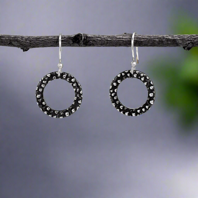 These sleek sterling silver hoop earrings feature a distinctive oxidised dotted design, adding texture and depth to a timeless style. Lightweight and versatile, they are perfect for elevating both casual and formal looks. The elegant 17 mm hoops (approx. 11/16 inches) dangle gracefully from French ear wires, ensuring comfort and effortless wear.