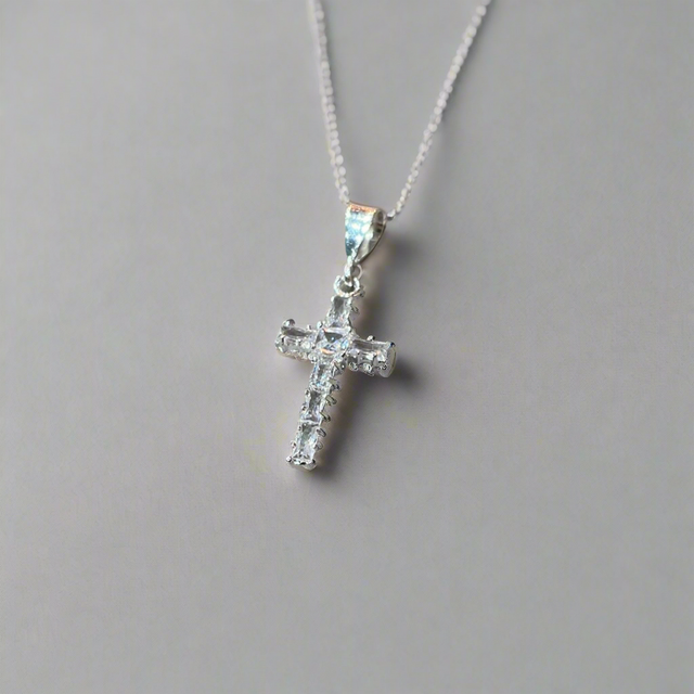 The Prisca Crystal Cross with Silver Frame Pendant offers a fresh take on a traditional design. Clear, sparkling crystals are precisely set within a handcrafted sterling silver frame, creating a graceful contrast between light-catching detail and sleek silver lines. It’s a refined piece that pairs beautifully with everyday or occasion wear.