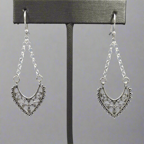 Croí Ornate Heart on Chain Silver Dangle Earrings