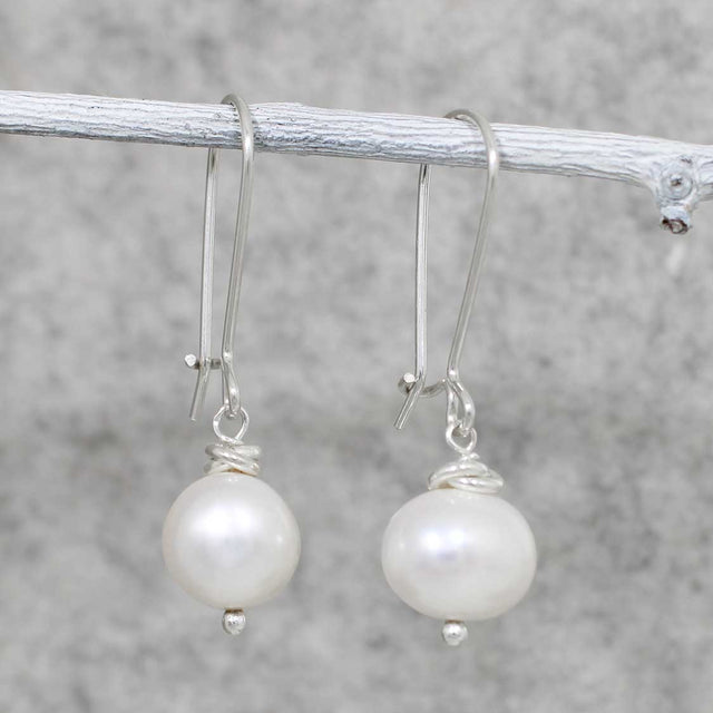 Handcrafted in solid .925 sterling silver, these charming dangle earrings feature natural white pearls with a softly irregular “potato” shape. Each pearl’s gentle curves and high lustre give the design a warm, organic character, making every pair beautifully unique.