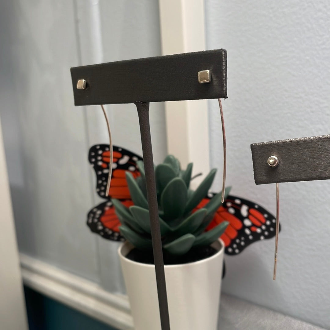These minimalist cube pin earrings are handcrafted from solid .925 sterling silver and polished to a bright shine. Designed with clean geometric lines, the tiny cube rests neatly at the front of the lobe, while the long silver pin runs along the ear for a sleek and modern profile.