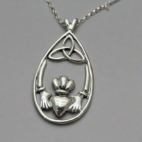 - Design: Drop-shaped pendant with Claddagh and Trinity Knot symbols