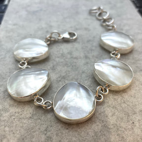 Handcrafted from solid .925 sterling silver, this bracelet features five sculptural links of luminous white mother of pearl. Each organic droplet is set into a polished silver bezel, highlighting the natural luster and subtle variations of the shell for a unique, refined look.
