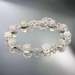 This bracelet features hand-carved roses in natural mother of pearl, spaced along a silver chain with a highly polished finish. The adjustable fit makes it perfect for gifting or everyday wear.