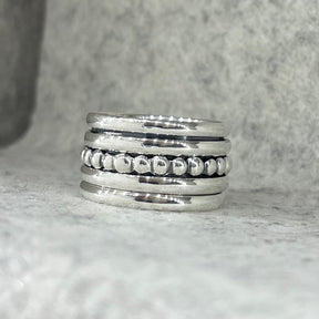 - Design: Wide silver band with three free-moving spinning bands (beaded center + smooth sides)